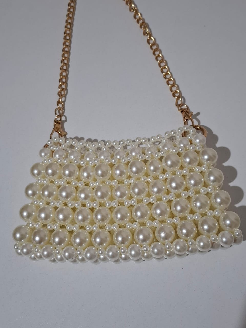 - Rectangular structure fully adorned with shimmering pearl beads for a glamorous finish.
